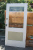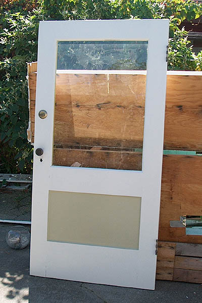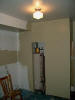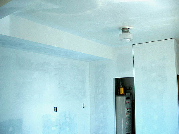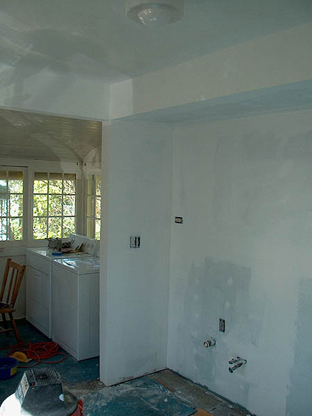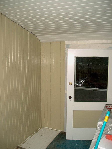 The door was stripped the rest of the way and given it's final paint job (yea!). We finished sanding and then priming the walls on Saturday night which merely brightened the room a little without giving us much of a sense of accomplishment. After spending all of Sunday morning with the grunt-work of prep'ing and cleaning the window trim and the bead-board in the laundry room, we felt like we hadn't done much. But then came time to slap some paint on the ceiling and walls! We were so encouraged by the progress with the ceiling that we pressed on with a late night and got MOST of the walls done, too! One evening this week should finish the first coat. Next weekend comes the second coat, then the floor underlay and hanging the first cabinets!