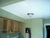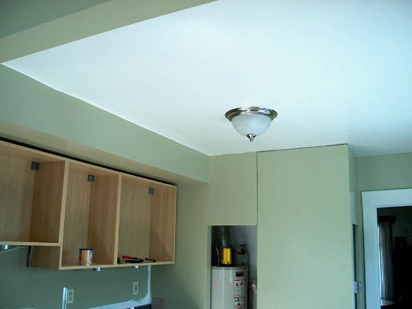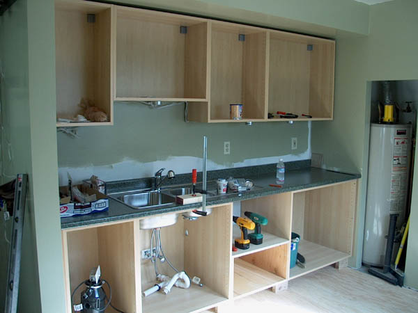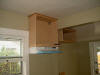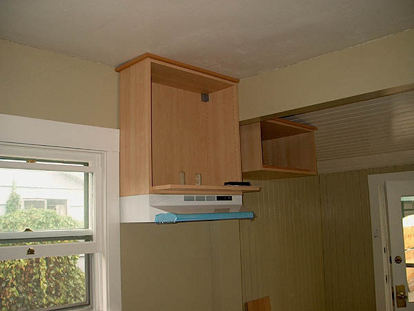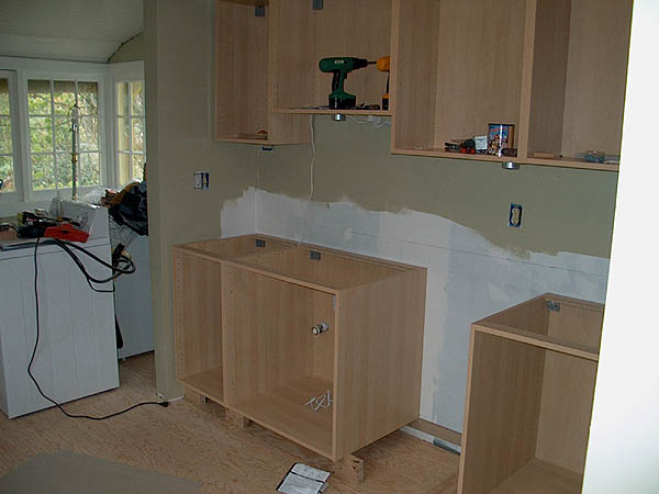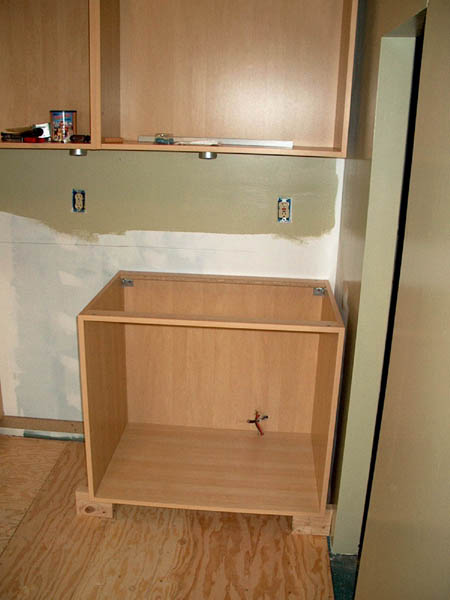 Francie and I both took some time off on Saturday morning (Rob for a gunshow and Francie for kicking around the house). By the time I finished a 3-hour "final" Home Depot run, we didn't get started until 3 PM. We did get the final wall cabinets hung, including installing the new range hood. [Incidentally, I don't think I've mentioned the problem with the range hood. We had intended to have it vent directly out the wall, but we found that a wall stud was dead center in the space we needed to run the ducts. Rather than spend DAYS and $$$ trying to work around the stud, we went the faster route of using the hood in a "non-ducted" mode. It still sucks air up from the range, but passes it through a charcoal filter and then returns it to the room.] We then moved on to building and installing the 3 base cabinets. There's a fourth space which will house the dishwasher and a home-built small cabinet underneath.