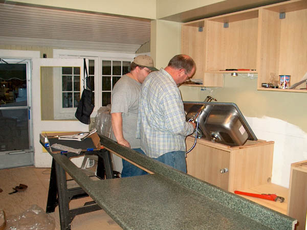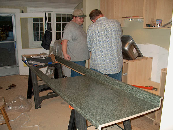 On Sunday, Rich had once again agreed to help us with some heavy lifting (installing the countertop). While I worked to finish the last miscellaneous pieces of the floor underlayment and the under-DW cabinet, Rich finished off the last of the electrical work (outlets, main room light, laundry room light, stove wiring) and Francie installed the under-cabinet lighting. When we were finally ready for the countertop, we set it up on sawhorses in the kitchen and did all our cutting there. The sink proved to be a MAJOR pain-in-the-butt because it's mounting system, while ingenious, didn't work for our application. I had to cut and re-cut the hole several times, then we took a LONG time to get the damn thing mounted. Finally, we put the counter in place and there were smiles all around.