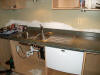 I took the day off work on Monday hoping to be finishing everything off. Right. Due to the morning off on Saturday and the fight with the sink on Sunday, we were so far behind that we knew the project would last into another weekend. I did get the room cleaned up from the previous two days work (tons of sawdust and tools everywhere). The floor underlayment was patched (screwheads and seams) so we can start laying the vinyl. The biggest change, though, was the final hookup of the sink, disposal and dishwasher! We once again have running water in our kitchen! Yeah! With a little luck, over the next several evenings we'll get the vinyl tiles laid and leave ourselves with only the details (backsplash tiles, shelves, drawers and doors) and the pantry for next weekend (not a full weekend of work).
