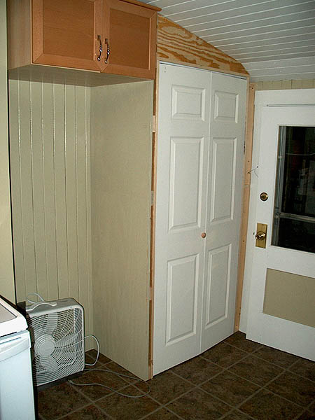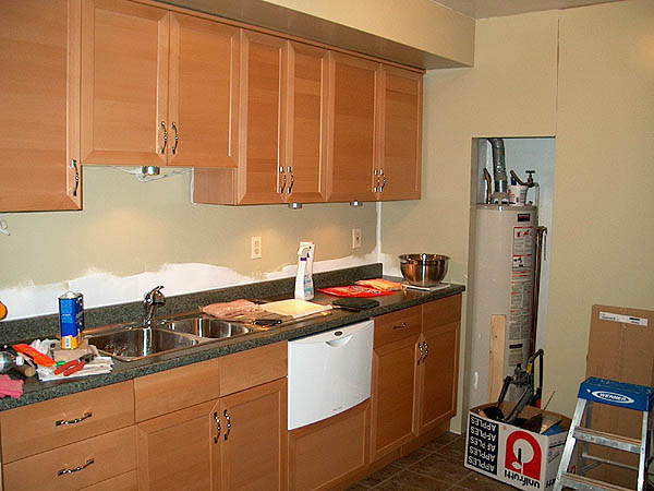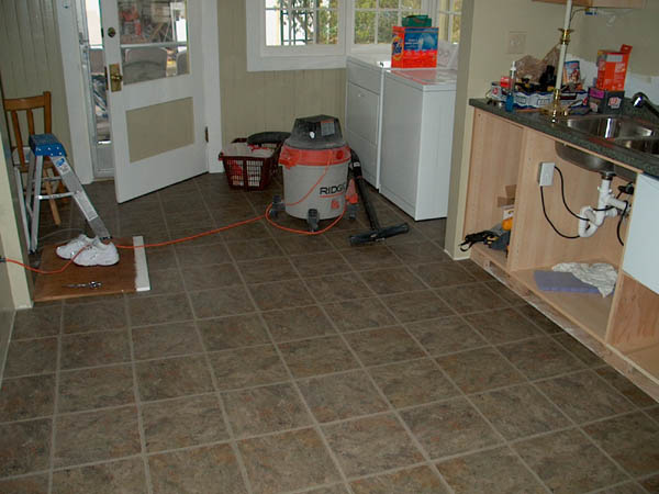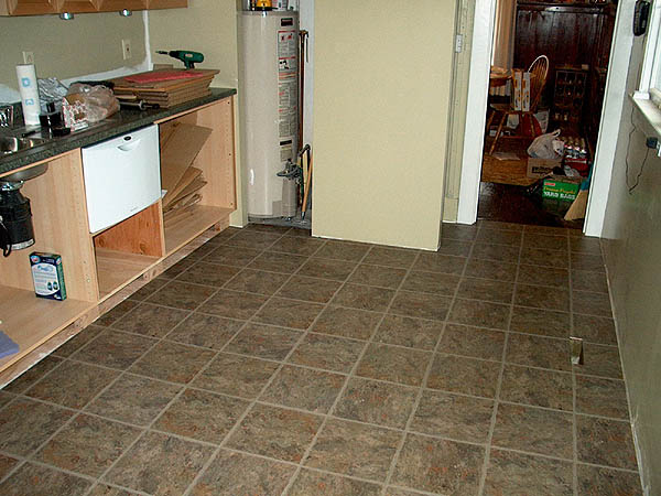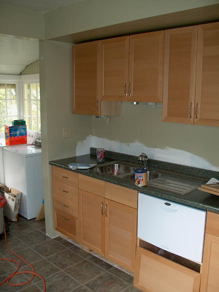 One last long weekend of heavy work. On Saturday I finished laying the vinyl tiles (we had started during the week) and began work on the pantry. Francie worked on installing the rest of the cabinet doors, drawers and shelves. We ran into an annoying snag: a couple pieces of the base cabinets were supposed to be installed before the countertop (centerpiece for drawers in the 36" base cabinet and the holder for the false drawer-fronts in the sink cabinet). We also discovered that we were shorted one drawer kit in our initial cabinet order, so Sunday morning started with an Ikea run.