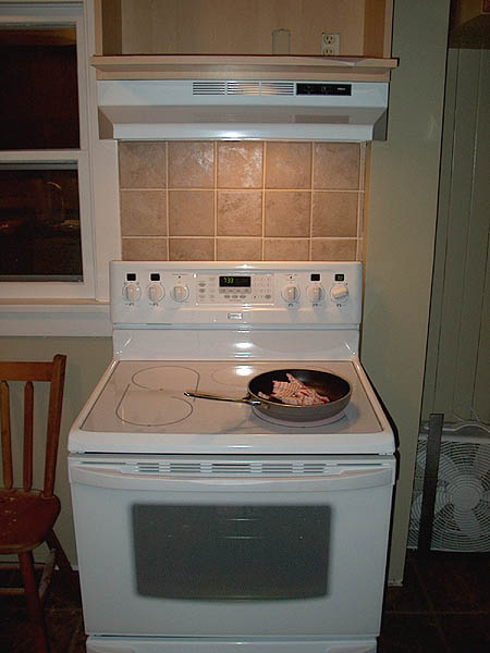 On Tuesday evening, the upper trim was added to the wall cabinets and we finally brought in our new stove! Have I mentioned the new stove before? We decided that our new kitchen needed a new stove. We found this GREAT deal on a top-of-the-line Kenmore Elite smooth-top range (half price). We cooked our first meal and it tasted great--eggs and bacon! When the kitchen is REALLY done, we'll christen it with a real meal.